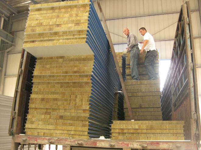 彩鋼巖棉夾芯板分機(jī)制板和手工板二種,彩鋼夾芯板是由內(nèi)外兩層彩色涂層鋼板作面層,通過自動復(fù)合成型機(jī),在鋼板上涂刷粘合膠水,同時在板兩側(cè)嵌入薄壁槽鋼,經(jīng)加壓、落料而成板材。